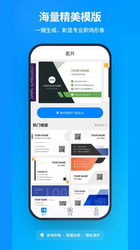 名片生成APP解决了用户日常繁琐制作名片的方式,不用打开电脑,更不用到线下找专业的人,在这里每个用户都能轻松上手,完成专属名片定制更加简单高效,不仅能节约时间成本,还能节约资金成本。简单稳定的名片制作工具,没有任何限制条件,快来下载试试吧!