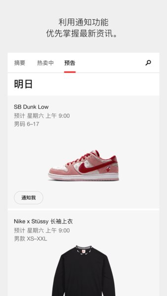 查看即将发售产品的信息,设定通知以获得钟爱鞋款。