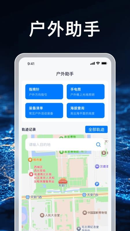 4、进入户外助手页面,可自由点击使用工具,还能直接输入目的地导航;