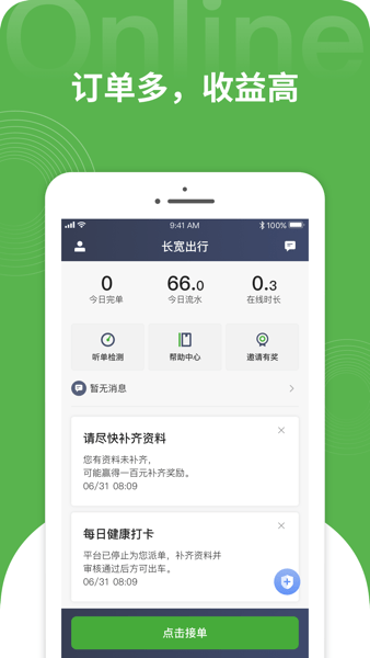 长宽出行司机端支持听单检测,内置帮助中心,可以为司机提供专业的接单工具,邀请新司机还有超值奖励发放,平台的订单也是非常丰富,有喜欢的小伙伴可以下载体验!