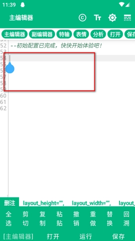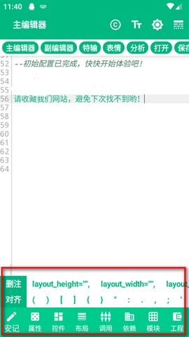 4、在编辑区输入代码,下方工具栏提供了常用符号和关键词的快捷输入,方便您快速编写。