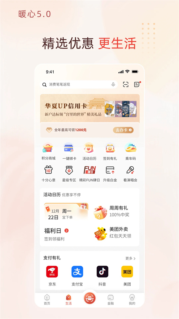 华彩生活信用卡app还提供了各种精彩的福利活动,包含了美食、电影、视听、出行、美妆、生活等领域,需要的朋友,快来领取吧。