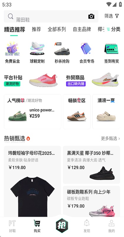 2、购买:精选推荐潮牌系列,平台补贴系列、外贸商品系列、热销甄选系列等;