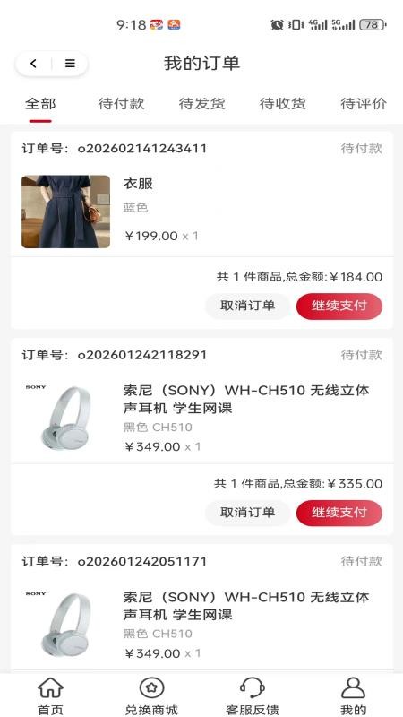 在我的订单功能中可以查看到待付款、待发货、待收货等全流程状态的订单信息。