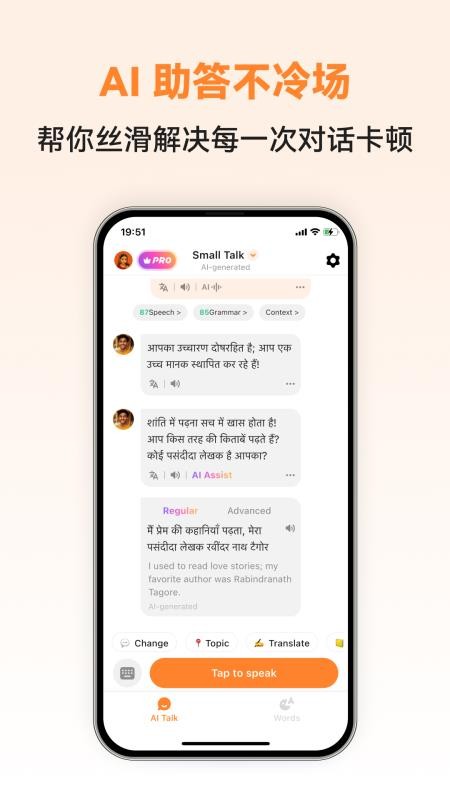 印地语智能口语app支持用户轻松实现印地语口语的练习,专属的AI助手可以帮助用户轻松对话,实时进行AI助答,有效选择场景化课程来进行学习,趣味探索更多的话题,更好的进行发音评测,进而可以轻松实现游戏化背单词,提升自己的口语能力。