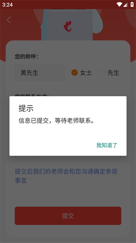 4、提交后显示预约成功,等待工作人员联系确认即可。