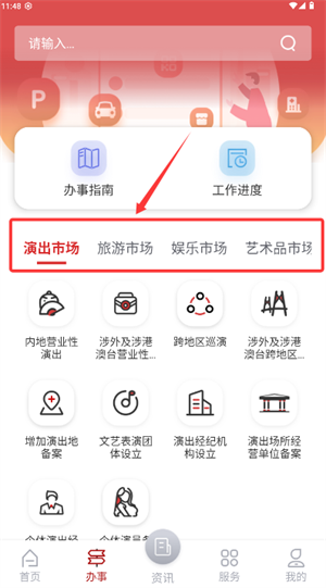 3、进入办事页面后,按演出或旅游类别筛选查找细分服务项目。