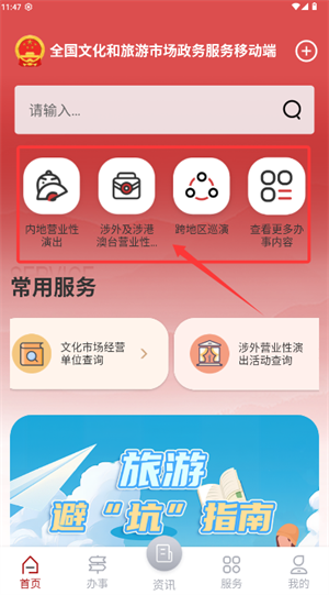 2、启动全国文旅政务移动端,首页可选择跨地区巡演等业务入口。