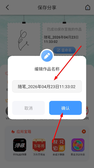 4、在编辑作品名称弹窗,修改名称后点击确认完成作品保存设置。