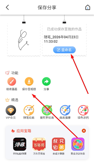 3、进入保存分享页面后可点击保存至相册,也可选择重命名修改作品名称。