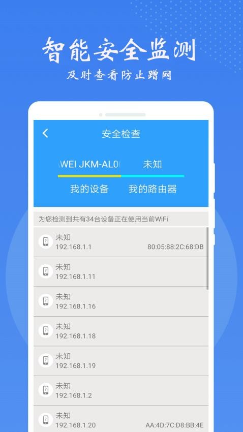 用户还可以利用软件快速检测是否存在蹭网设备,轻松防止蹭网,安全上网。