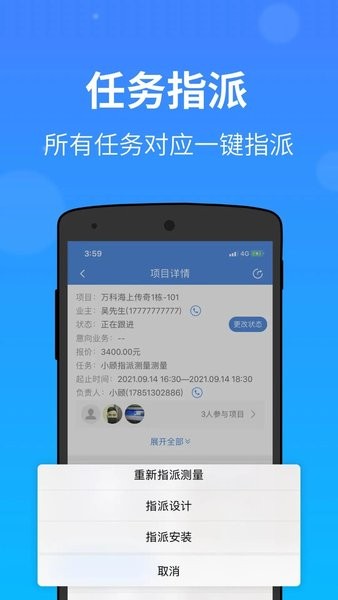 项目经理:老板、老板娘、设计师、员工、业主,同时在线,测量清清楚楚;