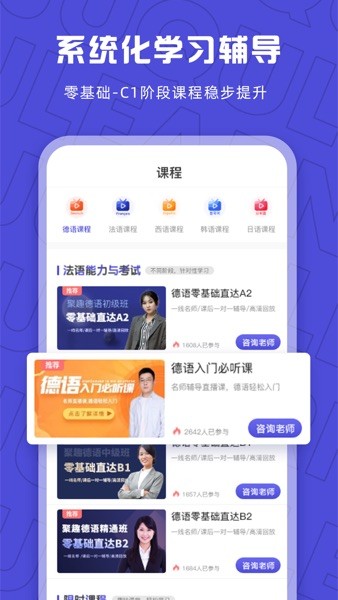 聚趣网校app汇聚德、韩、西、法、日五门语言专享课程,为您提供趣味的课堂内容,系统化的进行学习辅导,从零基础入门到精通,循序渐进!