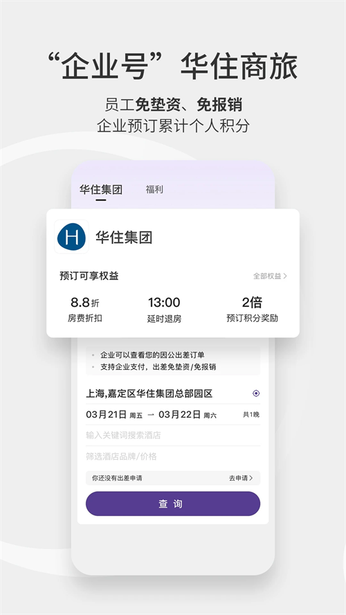 企业出差申请、审批,差标管控,企业统一支付结算,体验差旅闭环流程,员工免垫资、免报销,入住领取积分、优惠券等活动等您来参与,同时您还可以申请企业固定价,企业预订比个人更优惠。