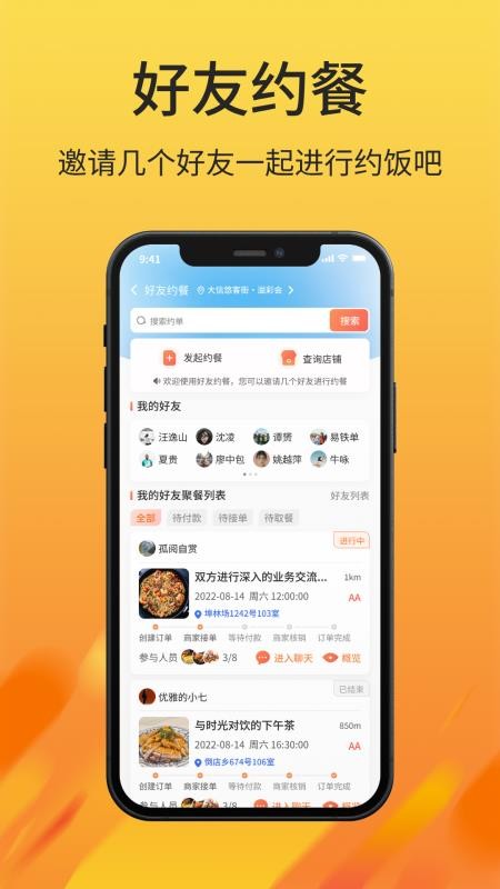 提供有好友约餐服务,用户可以随时在线查找好友进行约餐操作,邀约对方一起用餐。