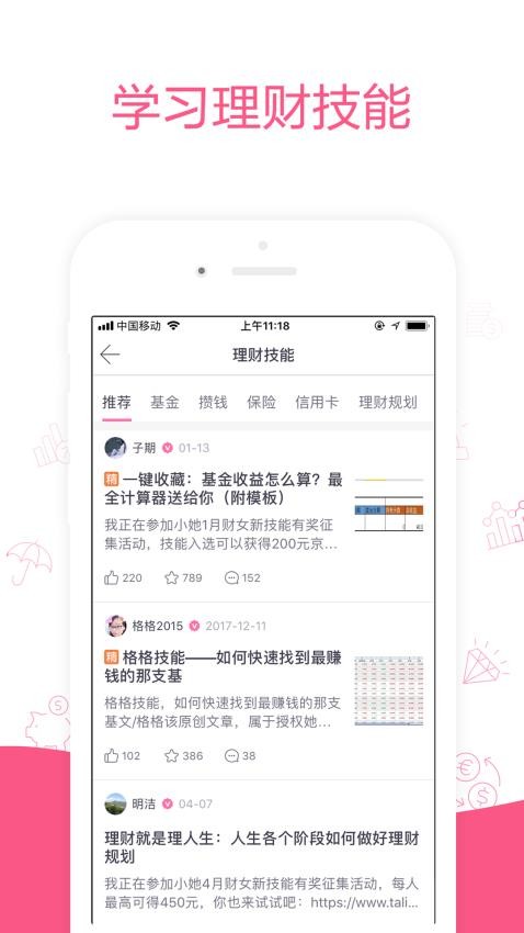 她理财APP让用户可以在这款软件上轻松的学习到多样的理财技能,提升理财能力;还为用户提供了一个很好的理财分享空间,可以随时在里面分享自己的理财心得体会,为他人提供理财参考;此外,里面汇集了很多理财话题,用户可任意选择参与讨论或者关注。