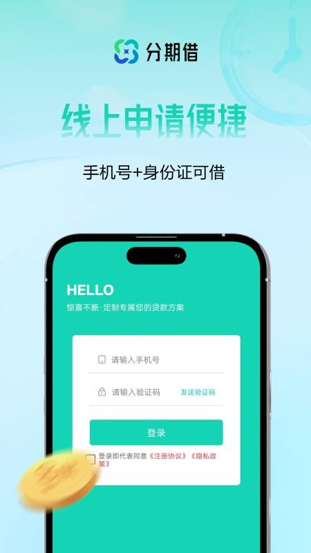1、在线下载并打开分期借APP,就能输入手机号和验证码登录;