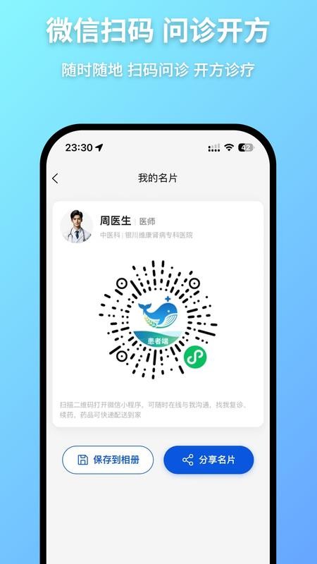 支持医生将自己的个人专属名片一键分享给你的患者,让患者扫码加你,以便更好的问诊工作。