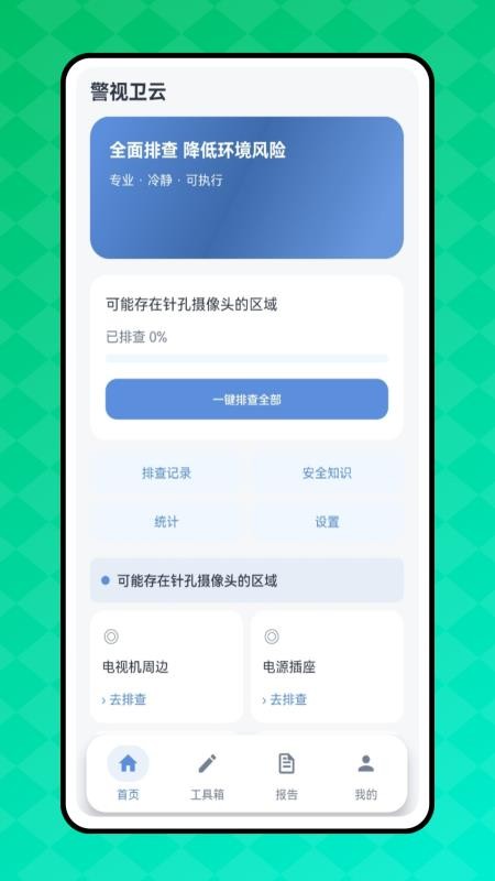 警视卫云app官方版是一款专为用户提供出行防偷拍监测工具的应用软件,软件可以对用户的出行住酒店安全来进行实时保障,进而可以全面排查相关的环境风险,轻松监测周边环境的针孔摄像头,对可疑区域来实现重点排查,科学划分重点区域,专业监测排查。平台还为用户提供了实用的工具箱,这里多种工具都可选择使用,实时进行现场监测,有效监测异常情况,进行安全核验,实时精准监测;此外,警视卫云客户端官网版还支持用户对相关的现场监测记录的数据进行统计分析,生成排查数据报告,清晰查看,快捷导出保存,有需要的用户就赶快来本站下载使用吧!