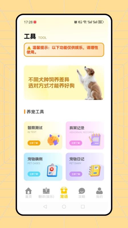 电子宠物APP一站式解决了用户日常繁琐的养宠问题,不仅仅能在应用中进行宠物语言翻译,还能使用诸多工具进行养宠逗宠,日常养宠更加简单方便,满足用户的使用要求;非常简洁直观的应用界面,所有功能都能一目了然,并且操作十分稳定,快来下载试试吧!