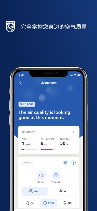 通过飞利浦智净家可以够对设备进行遥控并获得与所有空气问题(包括污染物、过敏源和气体)有关的通知,让您无论是在家中还是外出时都能掌控一切。随时获得关于过去和现在空气质量数据的深刻洞察,让您完全控制空气质量,提供清洁、健康的空气。