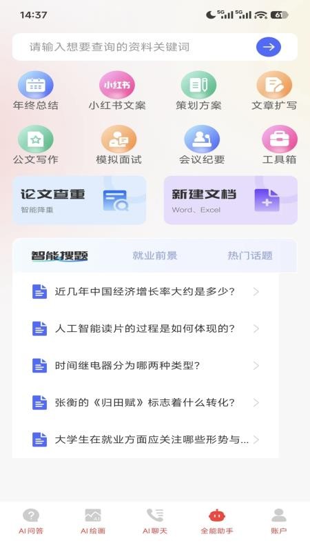 多样化的搜索模式,无论是搜题、就业前景还是热门话题等,均可在线搜索;