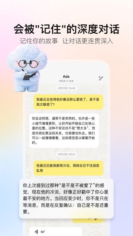 MeetAda app是一款专为用户提供情绪梳理和对话倾听的应用软件,软件为用户提供了专属的AI伙伴,方便用户和聊天机器人来进行实时对话,更好的进行语音交流互动,方便用户智能对话,就可让你实时进行专业倾听,以此来更好的进行情绪察觉梳理,有效实现情绪管理。平台还为用户提供了强大的记忆系统,方便用户轻松记忆自己的感受,以此来进行深入对话,便捷分享自己的情绪;此外,MeetAda官方网站还支持用户对自己的成长数据进行深度洞察,清晰查看自己的成长变化,可视化的查看,有需要的用户就赶紧来本站下载使用吧!