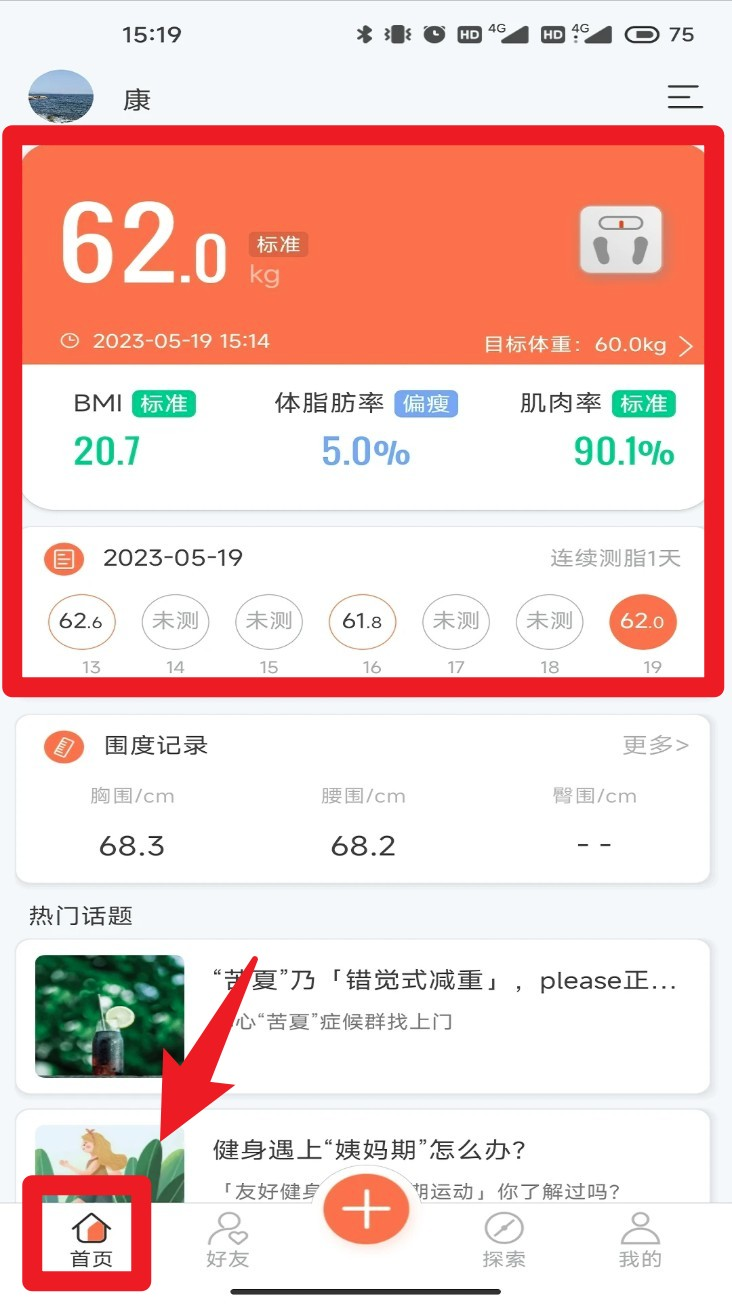 3.登录成功后在“首页”查看体重、BMI、体脂等数据,还可浏览热门健康话题内容