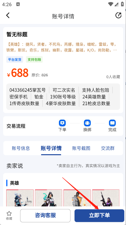 4、玩家点开想玩的游戏账号进入点击立即下单即可。