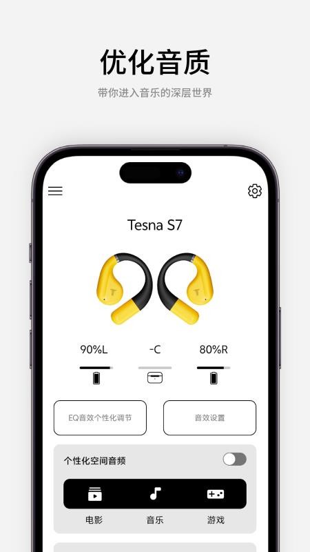 TESNA官方版app是一款可以搭配TESNA蓝牙耳机使用的软件,通过软件直接与TESNA旗下的蓝牙耳机进行绑定,你就可以对蓝牙耳机进行管理了,用户就可以根据自己的耳机使用需求,自由的调整耳机的音效,让你以后玩游戏、刷视频、看电影都可以获得更舒适的听觉体验。TESNA客户端还可以帮助用户进行快捷的设置操作,你可以设置各种快捷操作方法,让你可以直接通过耳机进行各种切歌、音量调节、语音助手等等,给广大的用户带来更舒适的体验,绝对符合你的使用需求,需要的用户赶紧来下载吧,让你管理好自己的TESNA蓝牙耳机!