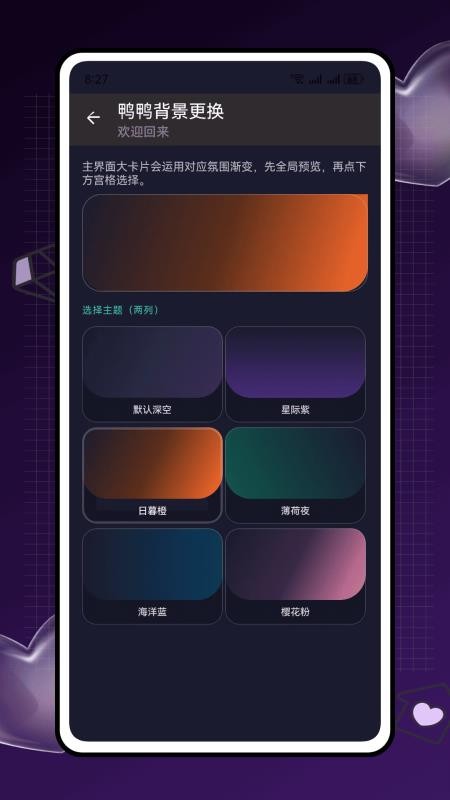 4、多种精美的主题背景,任由用户选用,还能回顾鸭鸭的喂养成长信息;