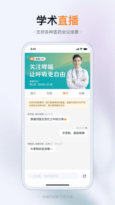 无界企业app是一款专为医药代表提供线上沟通互动和学术直播的应用软件,软件提供了线上的即时通讯,可以和医生来进行实时沟通互动,便捷分享医药信息,随心交流,有效进行远程拜访,发展更多的合作机会,进而可以一站式销售医药商品。平台还支持用户轻松开启自己的学术直播,创建医药会议,以此来进行多部门协作,有效解决医生的学术需求,便捷高效的直播开会;此外,无界企业软件官网版中还提供了丰富的资讯内容,更多的学术资讯都可查阅,了解前沿的研究成功,轻松提升专业知识,有需要的用户就赶紧来本站下载使用吧!