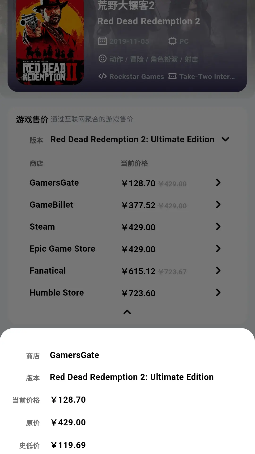 3.点进游戏封面进入到该游戏的详情页,这里可以浏览到游戏在某平台的售价,可以查看游戏攻略成就