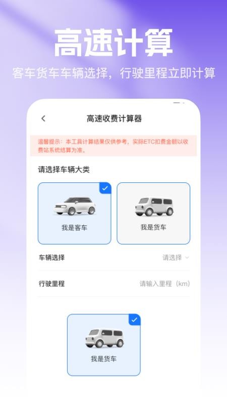 帮助用户轻松实现高速计算,让你可以一键计算高速费用,对其可以实时计算。
