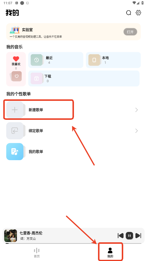 点击“我的”界面,可以创建个人歌单,添加自己喜欢的歌曲,方便以后快速播放。