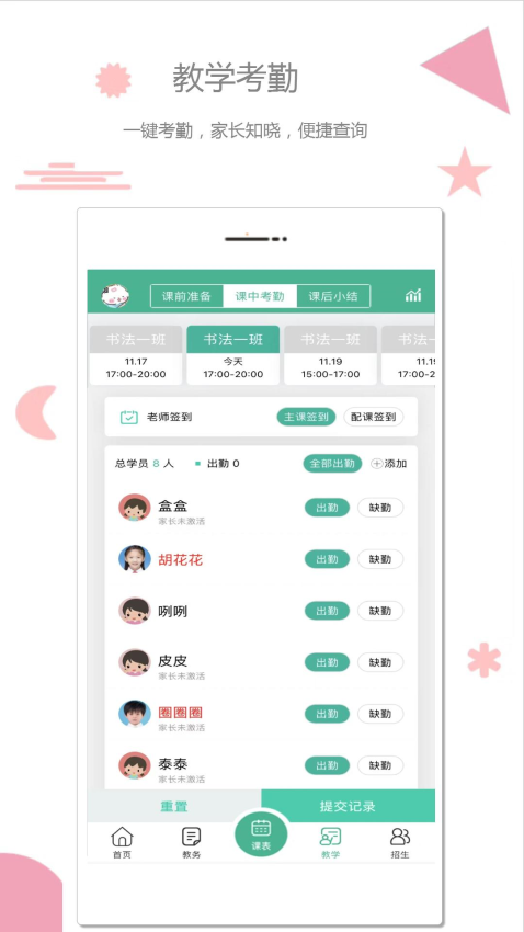 利用互联网云平台技术,雷小锋系统将培训机构的教务、教学、招生、运营、交流等五大核心管理流程,通过“一张课表”,解决不同角色老师的“简便易用、一看即会“的使用需求。在帮助机构降低管理成本的同时,通过为家长开放从结果到过程的监护和交流互动,帮助机构建立品牌口碑。