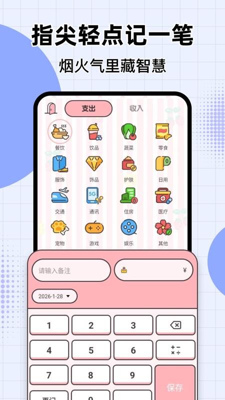 4、选择需要的收支分类后输入金额和备注,点击“保存”按钮来一键保存下来。