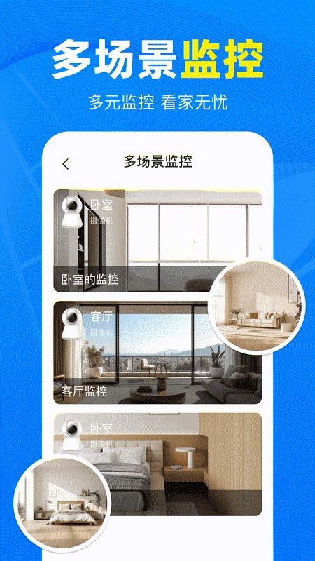 免费监控看家app软件是一款可以帮助用户实现远程看家的监控软件,可以添加许多的智能监控设备,以后就可以直接切换不同的设备进行远程查看,让你能够轻松的完成远程监控操作,随时都可以掌握家庭的监控情况,为你家庭生活提供安全的监控服务,以后看家轻松无忧;免费监控看家官方版支持绑定多个设备,让用户可以自由切换设备查看,这样才可以清楚的掌握不同房间的监控情况,通过软件就可以进行家庭监控、店铺监控、仓库监控等等,满足用户不同的监控场景,绝对可以为你带来更优质的监控体验,需要的用户快来下载使用吧!