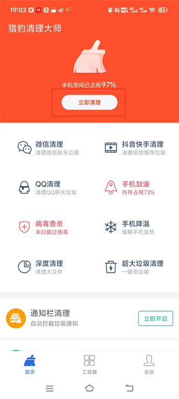 猎豹清理大师app是一款安卓手机用户必备的软件,有了这款软件之后你的手机用上好几年也不会存在卡顿,还能够帮助你拦截垃圾短信,告别烦人的通知打扰。