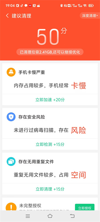 5、之后就可以完成自己的清除任务,了解这个软件为自己手机打的评分;