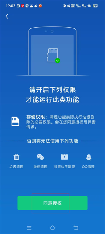 2、随后就会需要让你同意软件的权限管理,可以更加深入的对手机进行清除,点击下面的【同意授权】进行授权;