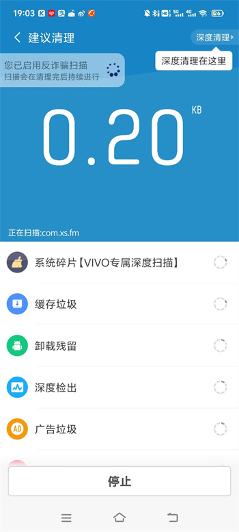 3、然后你的软件便会来到自动扫描的页面中,将所有手机中的垃圾全部都扫描出来,中间可以点击下方的【停止】随时终止自己的清除任务;