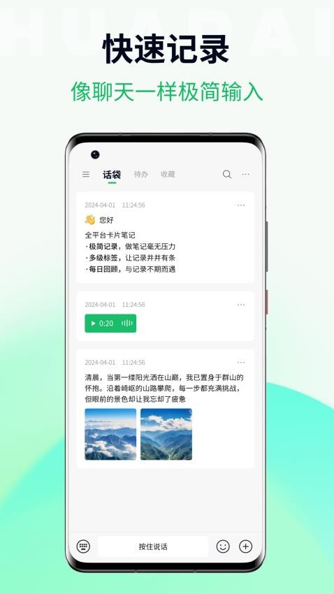 话袋官网版app是一款支持用户记录自己灵感笔记内容的应用软件,软件支持用户可以轻松高效的记录,极简的记录方式能够让你快速的输入,方便用户可以轻松捕捉自己的思维灵感,将自己的想法可以一键记录下来,就可以更好的保存自己的灵感。平台还支持用户对自己的笔记内容进行自动归类的整理,轻松解放用户的双手,以后查看笔记内容就非常方便了,分类的进行查找。此外,话袋最新版还支持多种形式的记录,对自己的笔记可以插入语音和图片,实现知识宝库的简历,更好的进行云端备份存储,有需要的用户就赶紧来本站下载使用吧!