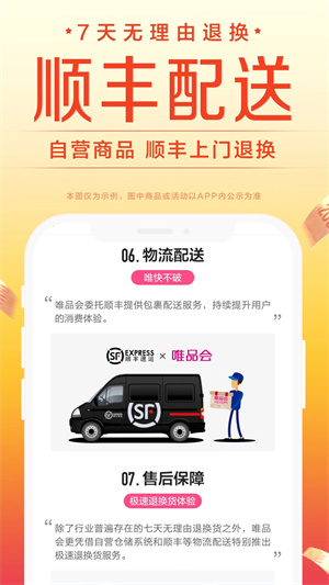 7天无理由退货,自营商品免费上门收件(自行寄回返10元唯品币);