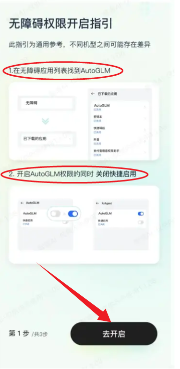 3.登录完毕后根据软件的指引开启无障碍权限,然后在无障碍应用列表找到AutoGLM,开启AutoGLM权限的同时关闭快捷启用.