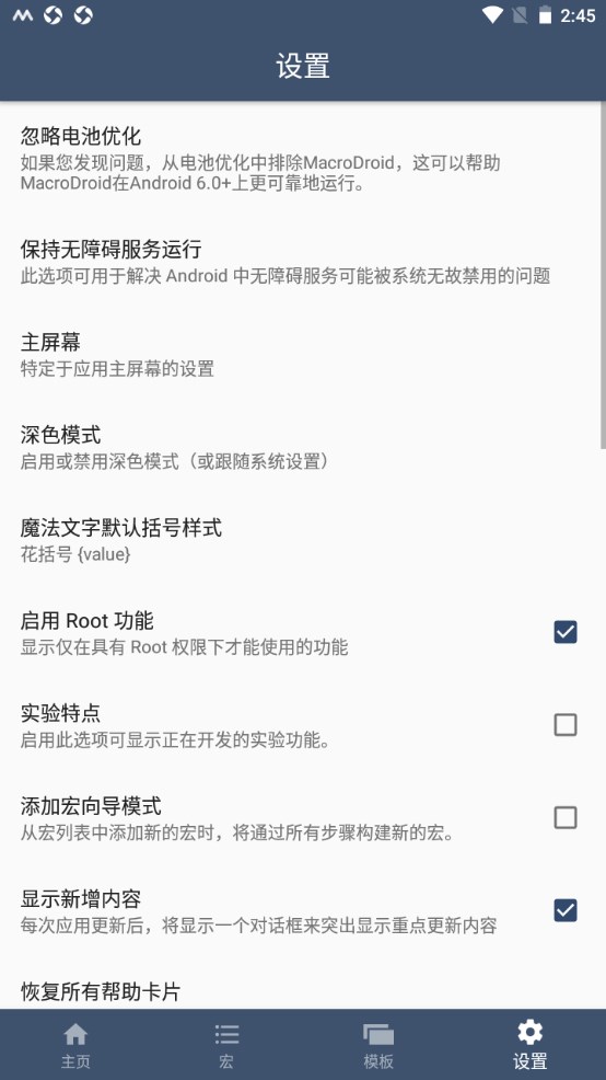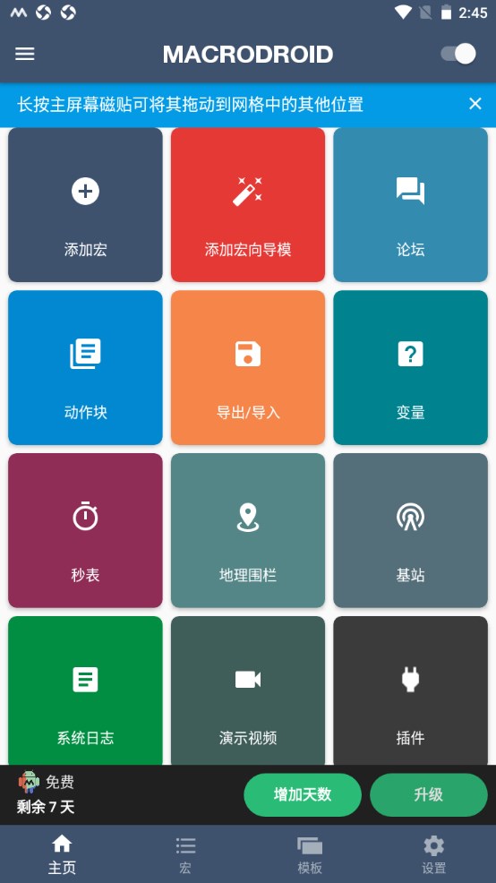 在使用时,你会有种软件作者是在亲自用这个软件的感觉,条件触发的方式都很“实在”,有一种没错我就是想要这个功能的共情感,像是在通知栏上面,MacroDroid为了保持后台活动会显示一条永久通知(可以选择不显示),在这条通知上可以更改自己的图标,以及给它配置各种功能按钮,而不是单纯占用空间。