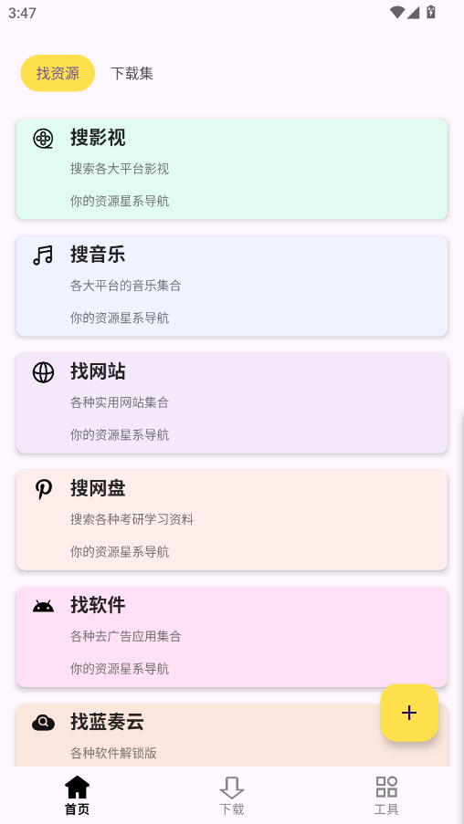 搜藏家是一款资源搜索应用,提供了多种资源查找服务,包括影视资源、破解软件、音乐资源等,功能非常全面。用户可以通过它轻松找到自己需要的文件,涵盖的种类非常丰富,几乎能够满足日常所需的各种内容。不仅如此,《搜藏家》还包含了许多实用的小工具,帮助用户提高效率和操作便捷性。