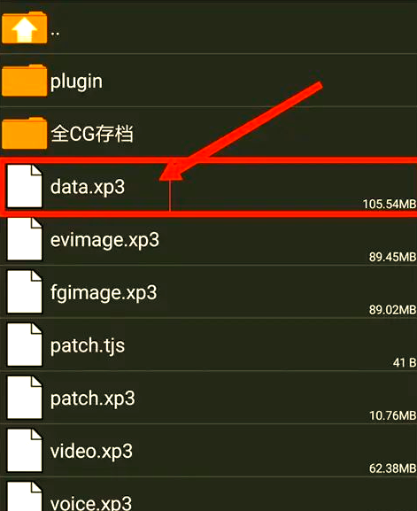4、进入【游戏文件夹】后,会看到一系列的游戏名称及相关选项。在此,我们需要找到并选择【data.xp3】这一选项。