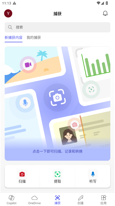 捕获的作用是用于收集和存储后期创建文档时所需的素材,创建文档才是 Office 的核心重要功能。