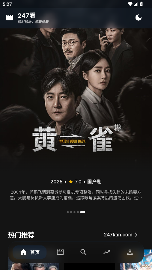 247看是一款界面设计精美、用户体验极佳的影视播放应用,采用仿Emby风格,提供丰富的影视内容。该应用无需广告干扰,支持免费观看各类电影、电视剧、动漫等,拥有专线流畅播放体验。用户可自由浏览各种资源,享受高质量的视频观看体验。此外,247看还支持高清画质、快速加载,并提供简洁直观的操作界面,让你轻松找到自己喜欢的影片,随时随地享受娱乐时光。